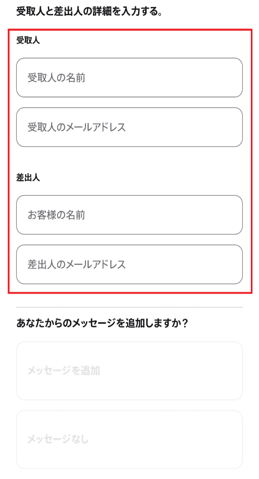 受取人と差出人の「名前」と「メールアドレス」を入力。