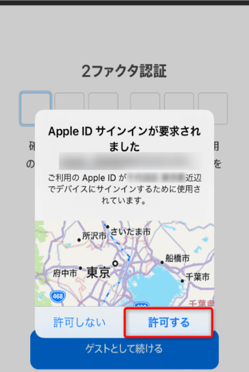 「Apple IDサインインが要求されました」というポップアップが表示されるので、「許可する」を選択。