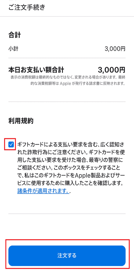 利用規約をチェックして「注文する」をタップ